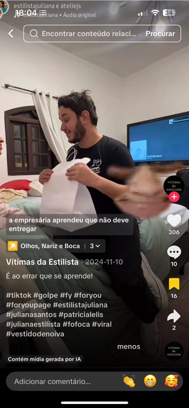 No Post 236, a página “Vítimas da Estilista” mais uma vez expõe indevidamente um vídeo íntimo e pessoal, que nada tem a ver com o exercício da minha profissão. O vídeo mostra o momento em que entreguei uma camisa feita por mim ao meu noivo Fábio, durante a comemoração do nosso aniversário de um ano de namoro.