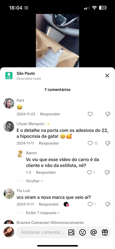 - Acusação política – Uma seguidora me chama de “bolsonarista” devido a adesivos do número 22 que aparecem na porta de um carro. É importante destacar que esse carro não é meu, mas sim da cliente Ana (a mesma envolvida no episódio da caixa de sapato). Trata-se de uma tentativa de me rotular politicamente com base em uma informação falsa.