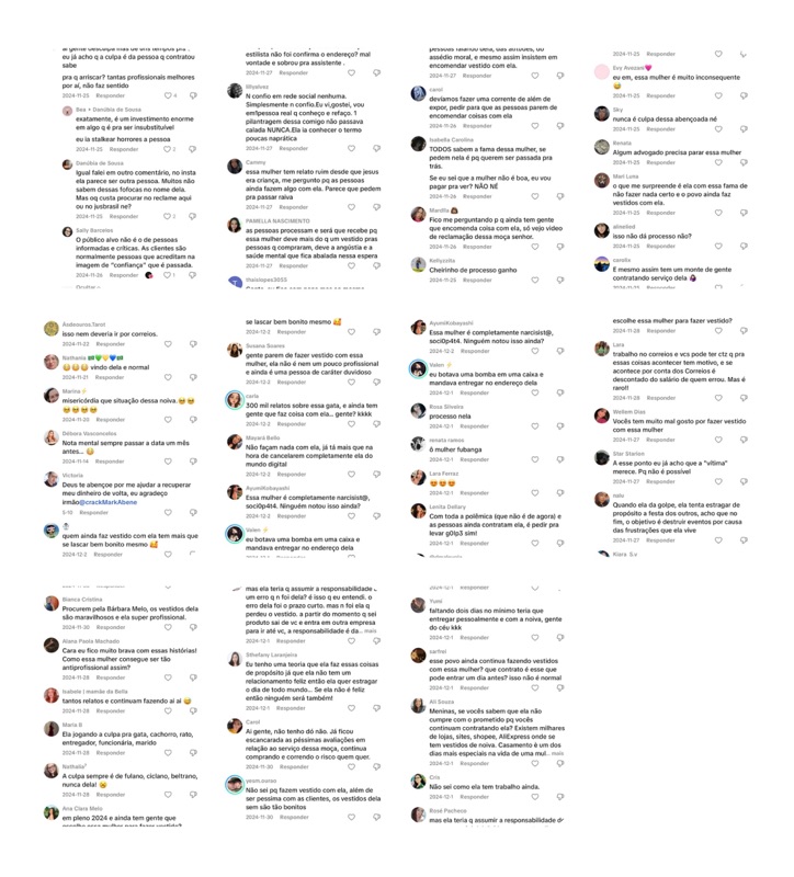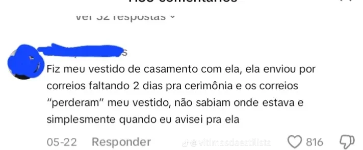 Comentário: “Esse negócio com estilista de noivas, o que mais tem é gente incompetente que não assume os erros, sempre tem uma desculpa esfarrapada.”