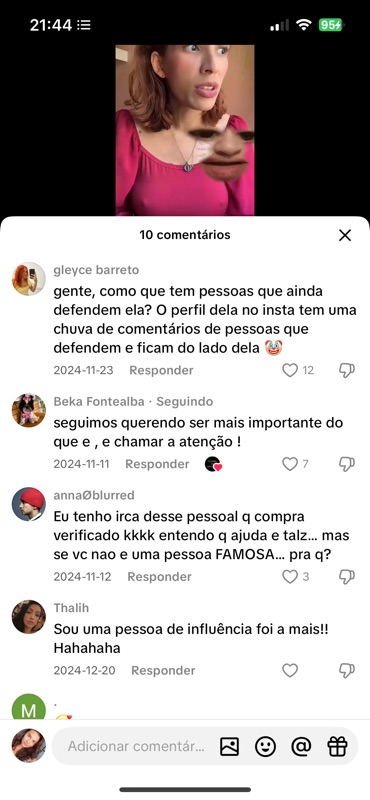 “gente, como que tem pessoas que ainda defendem ela? O perfil dela no insta tem uma chuva de comentários de pessoas que defendem e ficam do lado dela 🤡”