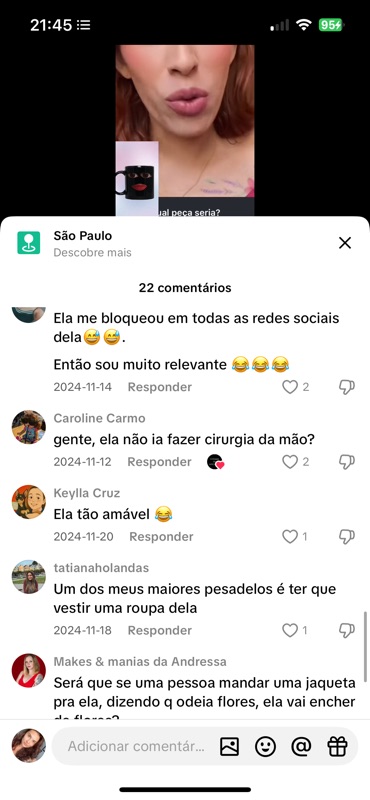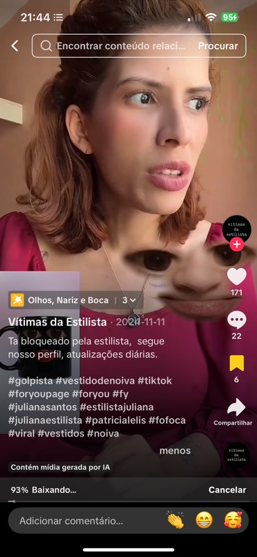 Após essa chamada irônica, o vídeo prossegue com cerca de 4 minutos de reprodução dos stories da estilista, sem apresentar qualquer denúncia ou prova concreta. A legenda associada ao vídeo reforça a linha de perseguição: