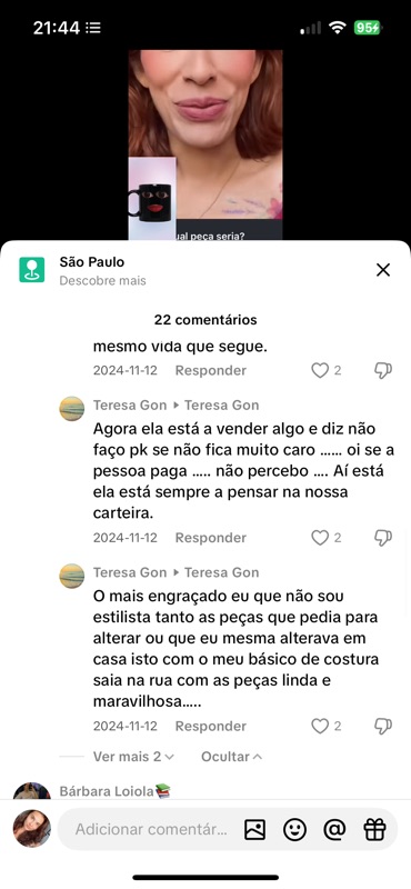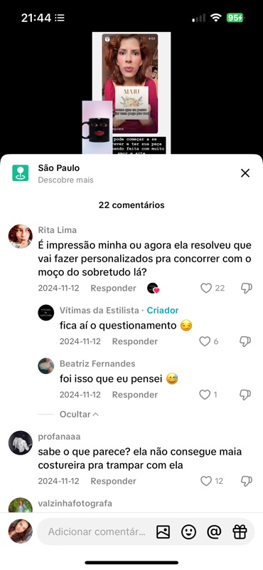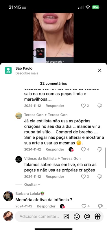 - ➝ Crimes: difamação, escárnio profissional e descredibilização pública, reduzindo a estilista a alguém que “dá esmola” e insinuando que não tem capacidade criativa.