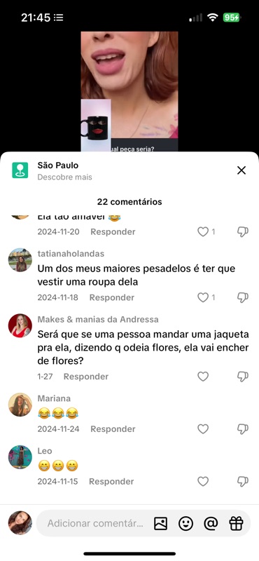 - “Será que se uma pessoa mandar uma jaqueta pra ela, dizendo q odeia flores, ela vai encher de flores?”