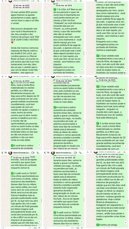 Eu nunca “me aproveitei” de nada. Fui procurada inicialmente via direct e, posteriormente, troquei mensagens diretamente com a equipe da atriz, que demonstrou abertura para a ideia de usar um dos meus vestidos em um evento do filme. Todas as conversas estão salvas, incluindo ligações e prints, provando que a comunicação foi consensual e profissional, sem qualquer tipo de “invasão de espaço”.