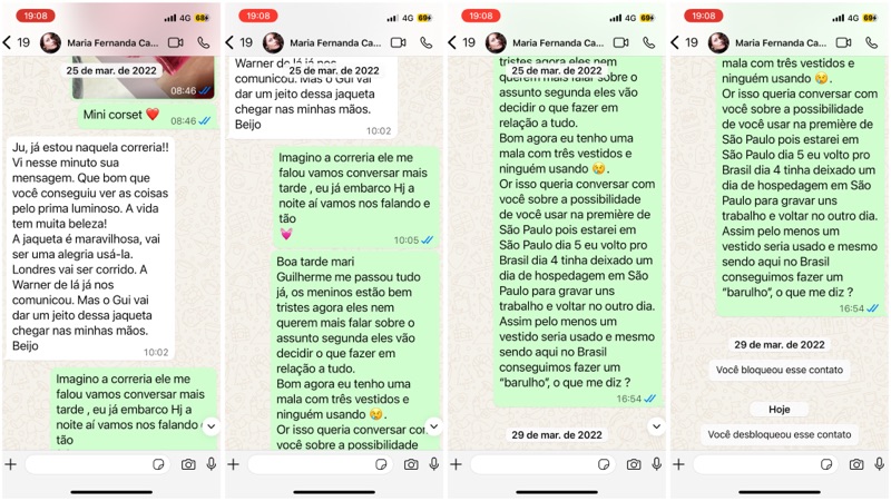 A última mensagem que recebi foi do assessor de imprensa da Maria Fernanda, agradecendo pela disponibilidade e dizendo que ela usaria o vestido em São Paulo. Agradeci, enviei uma última mensagem para ela e, logo depois, bloqueei o contato – de tanta decepção que senti no dia da pré-estreia.