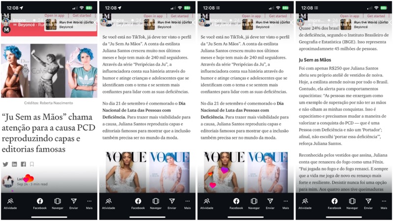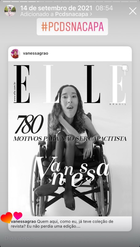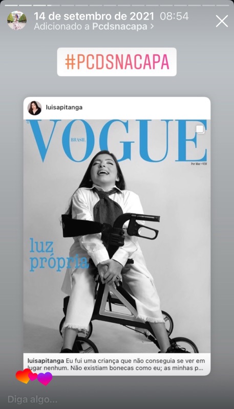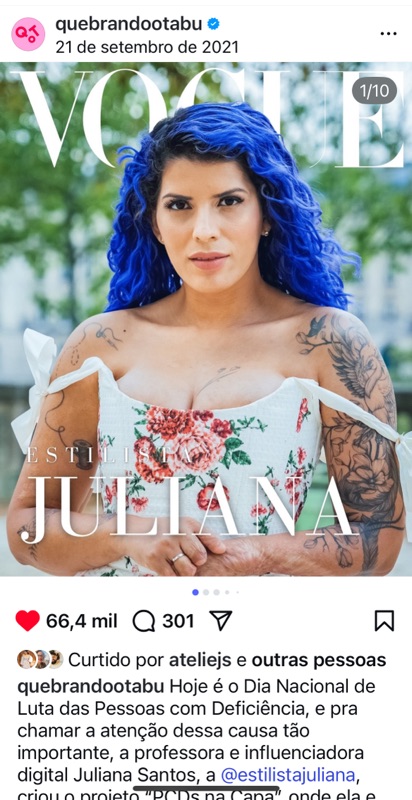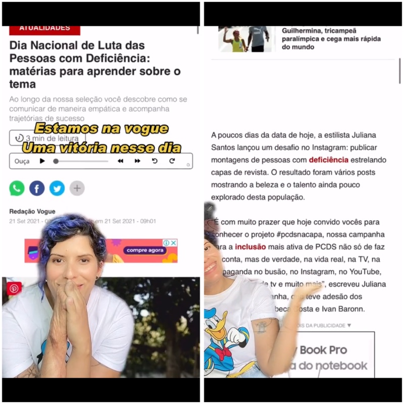 O resultado foi gigantesco. A hashtag #PCDsNaCapa explodiu. Centenas de pessoas com deficiência criaram suas capas, influenciadores grandes e pequenos abraçaram a campanha, e naquele 21 de setembro, Dia da Luta pelos Direitos da Pessoa com Deficiência, pela primeira vez, a gente conseguiu furar a bolha. Saímos no Instagram da Vogue, no site da Vogue, no Quebrando Tabu, na Mídia Ninja. O mundo olhou pra nós, nem que fosse por um dia.