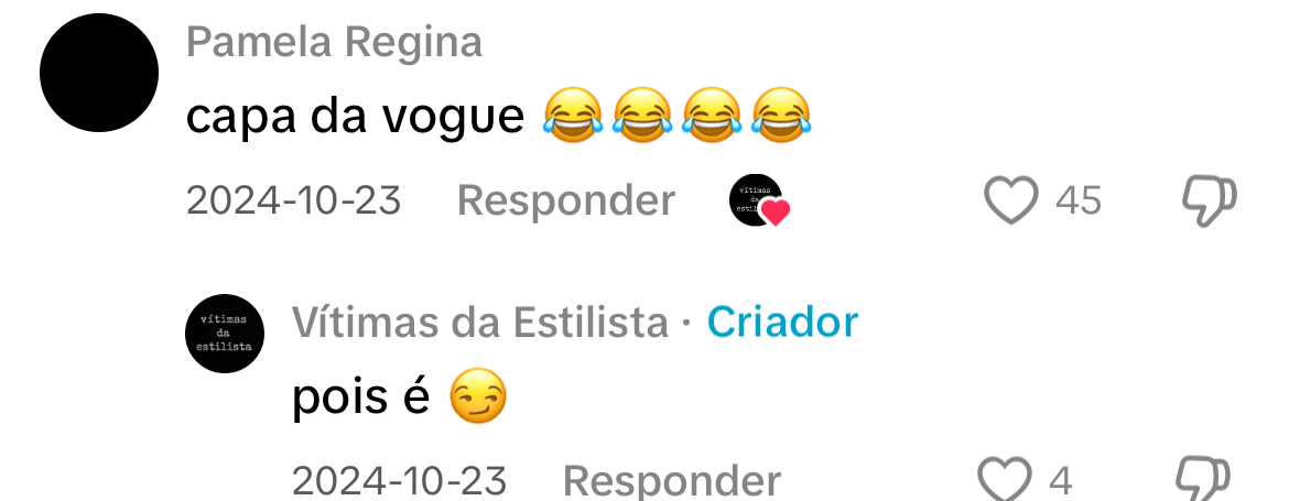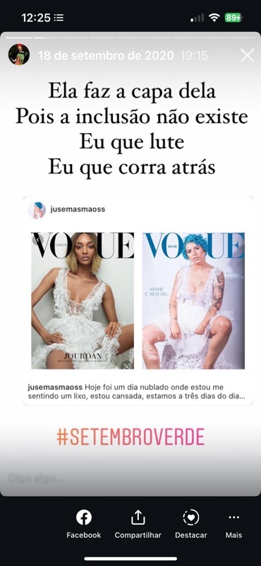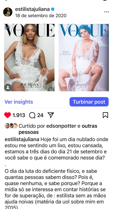 Aqui ficou escancarado que não existe busca pela verdade, existe roteiro. Existe narrativa fabricada para me pintar como o monstro perfeito, custe o que custar. A prova disso está em um detalhe gritante: em um dos comentários – que eu vou destacar depois – alguém pergunta “mas onde está essa capa?”. E a resposta do perfil Vítimas foi: “não encontramos, acredita? Procuramos e não achamos”. Mentira. Uma mentira descarada. Essas mesmas pessoas vasculharam o meu Instagram de ponta a ponta, invadiram meu Facebook pessoal, desenterraram postagens de 2017, 2018, 2021, fuçaram minha vida inteira. Mas não acharam – ou fingiram não achar – algo que está no terceiro destaque do meu Instagram, na parte de imprensa, com a minha foto simulando a capa da Vogue? Algo que está também no destaque “PCDs na capa”, com todas as capas criadas na campanha, registradas, salvas, públicas até hoje? Elas sabiam que se mostrassem a capa real, a farsa caía na hora. Seriam desmentidas imediatamente, porque todo mundo veria que não tinha nada a ver com a história inventada por elas.