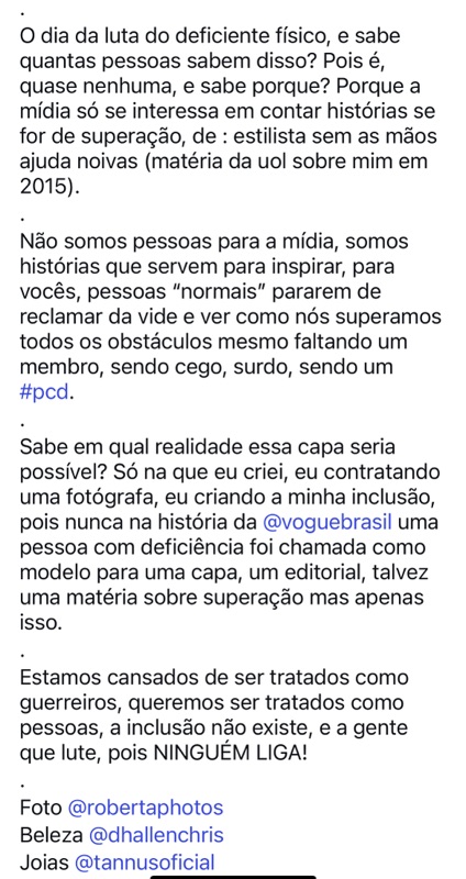 É assim que começa mais uma mentira inventada sobre mim. Segundo esse áudio, supostamente de uma ex-funcionária, eu teria dito que viajaria para Paris para fotografar a capa da Vogue daquele mês. E, pra piorar, elas terminam dizendo que essa capa era falsa, feita por mim, como se eu tivesse inventado tudo. É uma frase rápida, solta, jogada ali sem qualquer contexto, mas que carrega um peso enorme. Porque não é só uma mentira. É uma tentativa cruel de desmerecer uma das maiores conquistas da minha vida – não como estilista, mas como ativista PCD, algo pelo qual eu lutei com todas as minhas forças para realizar. E é disso que eu vou falar agora. Vou mostrar o quão vil, manipulador e covarde foi esse ataque, tentando transformar uma história de superação e luta social em motivo de piada.