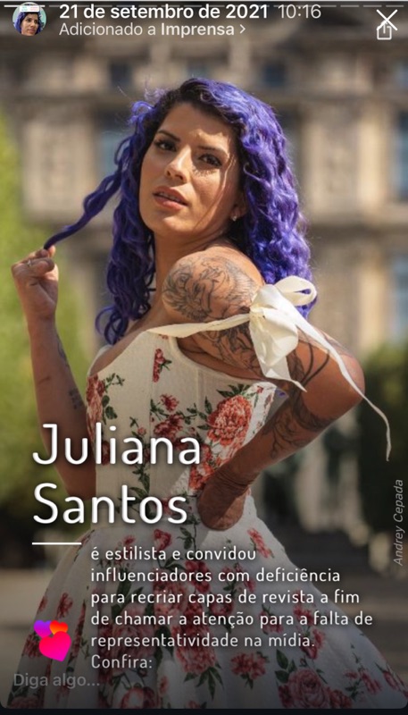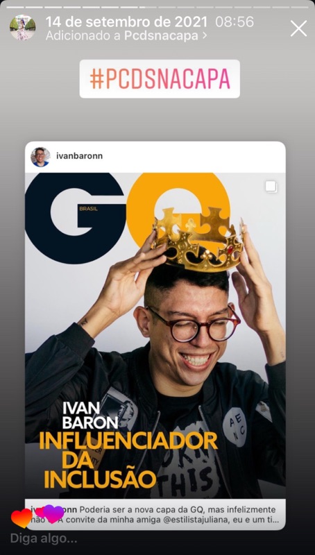 Foi tão lindo que outros influenciadores colheram frutos incríveis disso. O Ivan Baron, que simulou uma capa da GQ, foi chamado pela própria GQ e fez uma reportagem maravilhosa. O Daives, um jovem incrível com deficiência no braço, foi convidado pela ONU para representar jovens PCDs. Vários outros cresceram, ganharam voz, espaço, oportunidades. Isso é o que o PCDs na Capa fez.