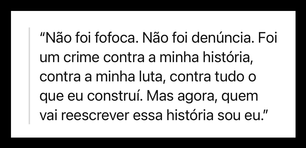 Essa mentira é apenas mais uma tentativa covarde de reescrever a minha história, tentando manchar a minha imagem com narrativas inventadas. Mas aqui não tem espaço para ficção: tem provas, tem datas, tem imagens, tem testemunhas.