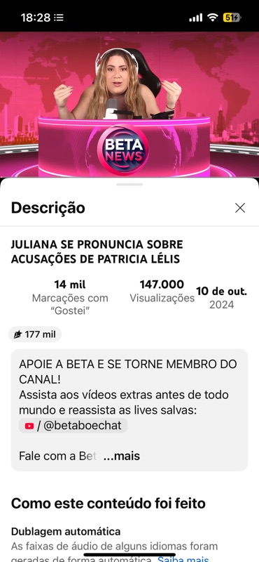 YouTube- Beta- Live 11 Beta propaga acusações de Patrícia sem provas, recusa ouvir o outro lado e mantém exploração da imagem para monetização”