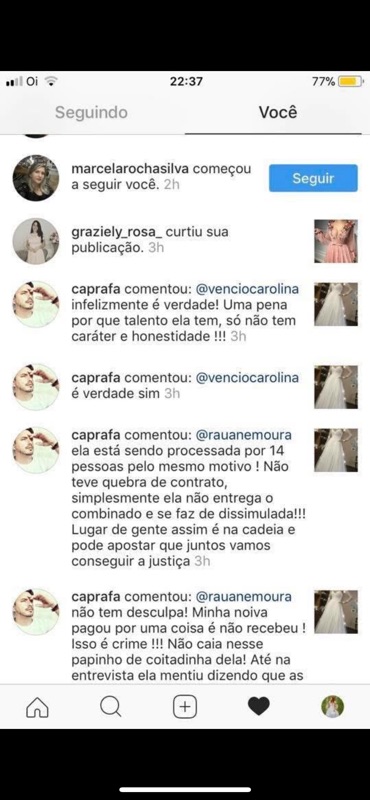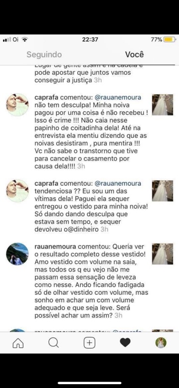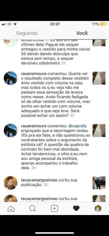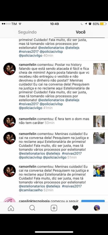 Apesar disso, esse episódio foi transformado em combustível para ataques coordenados na internet. A cliente — que hoje participa ativamente de grupos e páginas organizadas para me difamar — omite os fatos essenciais e apresenta sua versão como vítima de um crime, distorcendo o caso para me expor publicamente. Ignora que dezenas de outras noivas participaram da mesma campanha e tiveram suas peças entregues, sem qualquer problema.